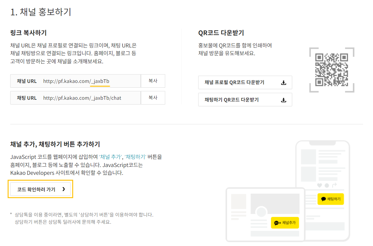 그 다음엔 바로 아래에 있는 ‘채널 추가, 채팅하기 버튼 추가하기’ 메뉴의 ‘코드 확인하러 가기’ 버튼을 클릭해주세요.