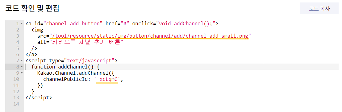 우선 10번째 줄에 있는 channelPublicId : 의 뒷부분에 조금 전 복사해서 메모장에 옮겨놓았던 채널 URL의 뒷부분을 붙여 넣어 주세요.