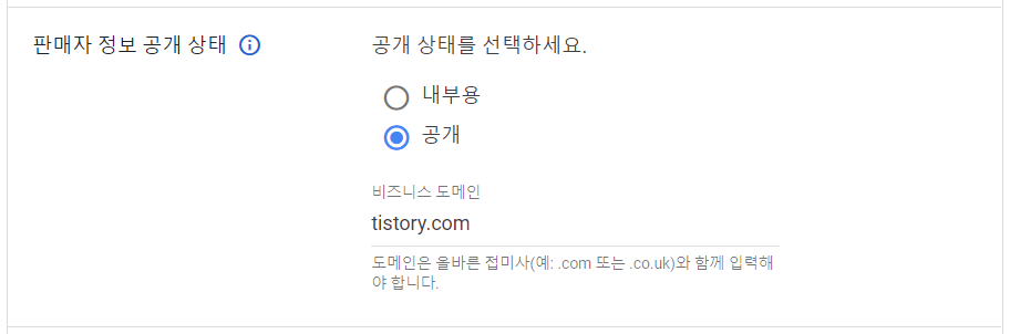 공개 상태는 '공개', 비즈니스 도메인에는 'tistory.com'을 입력해주시면 됩니다.