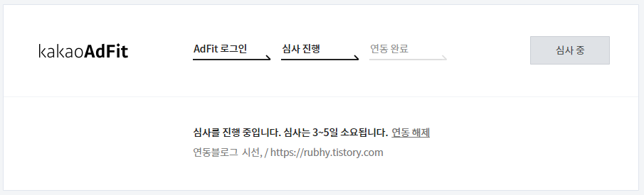 '심사 진행'으로 현재 상태가 변경되면 카카오 애드핏 신청이 완료된 거예요.