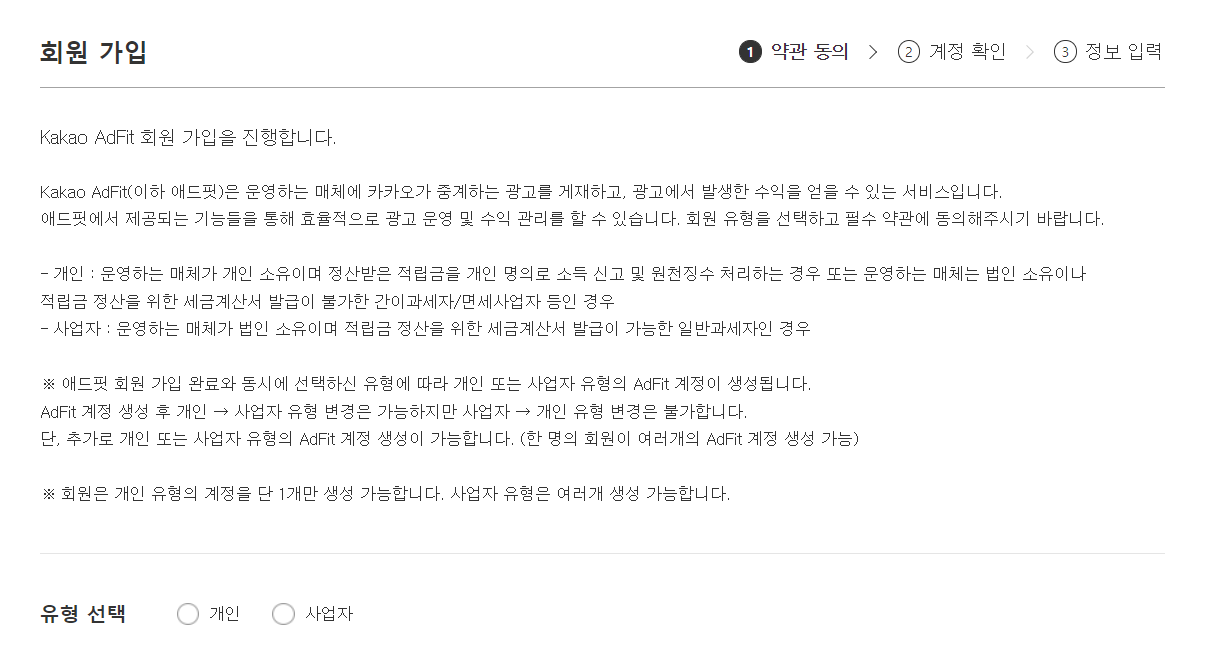 회원 가입 약관을 읽어보고 유형을 선택합니다. 저는 '개인'으로 선택했어요.