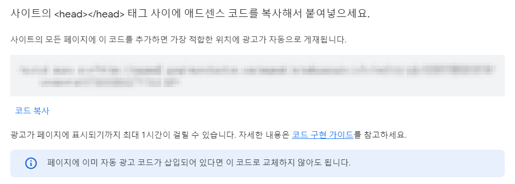 클릭해서 팝업창에 뜬 애드센스 코드를 복사해주세요.