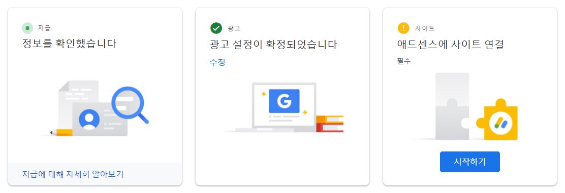 다시 구글 애드센스 사이트로 돌아와서, 이제 마지막 '애드센스에 사이트 연결'에서 '시작하기'를 클릭해주세요.